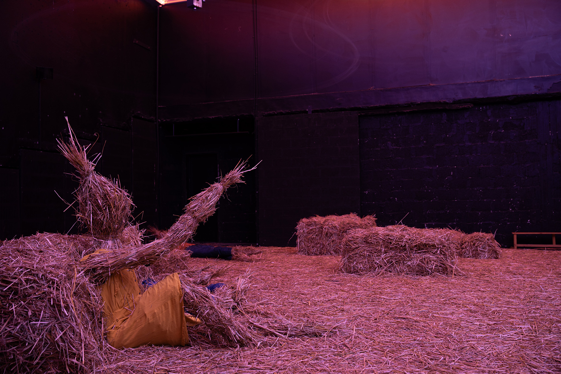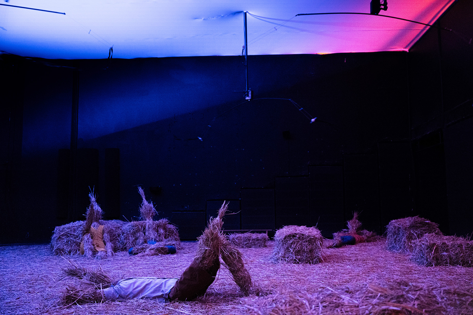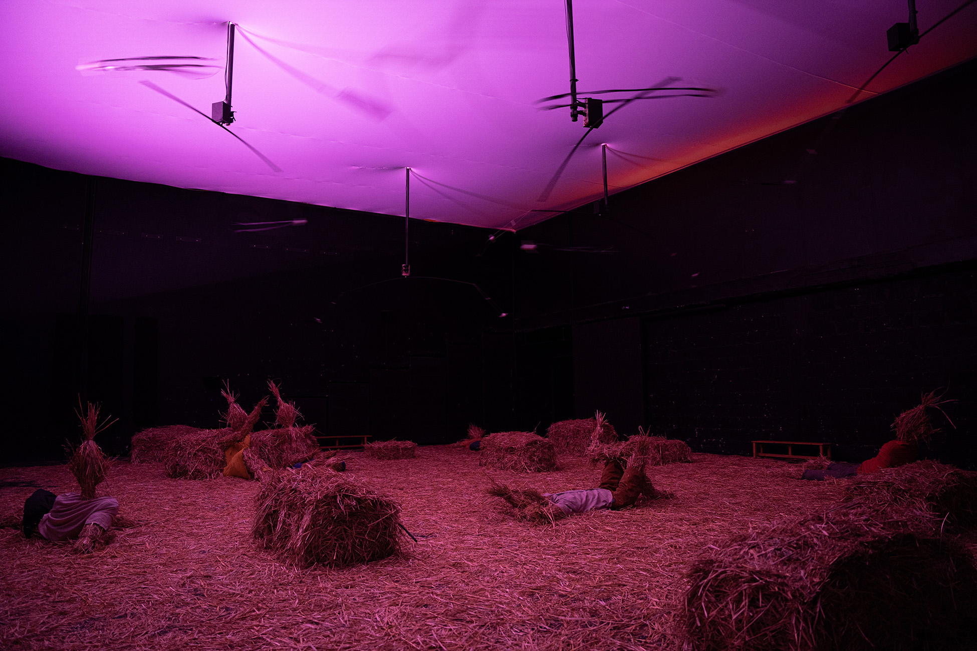 In 'The Dreamers' Solo Exhibition, the central theater hall of HAZIRA, transforms into a post-human realm, a perpetual tension between two worlds: the celestial and the earthly. Above, artificial sky, and below, the stage as the ground.