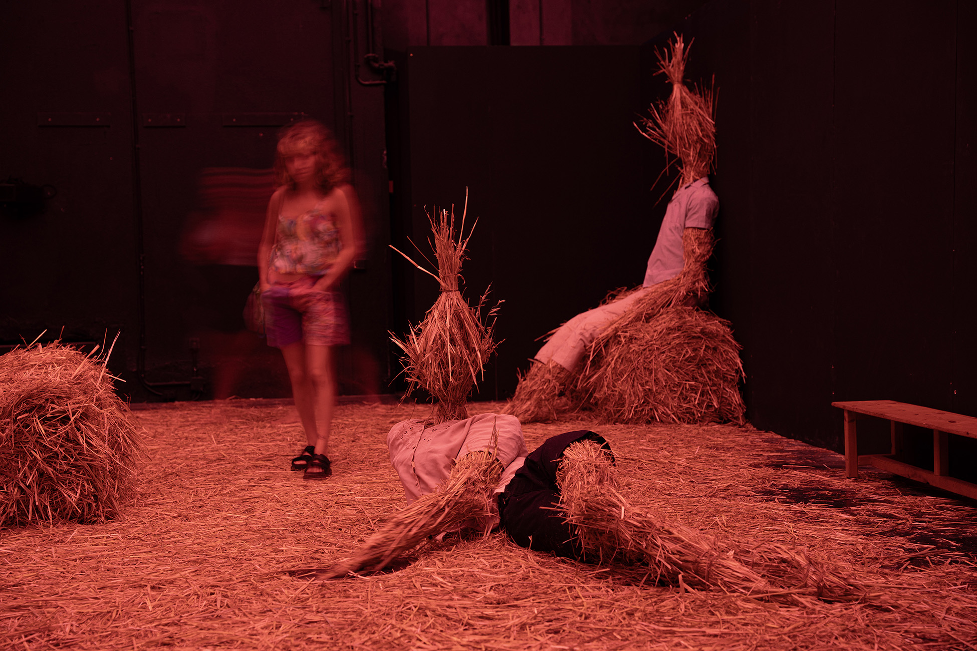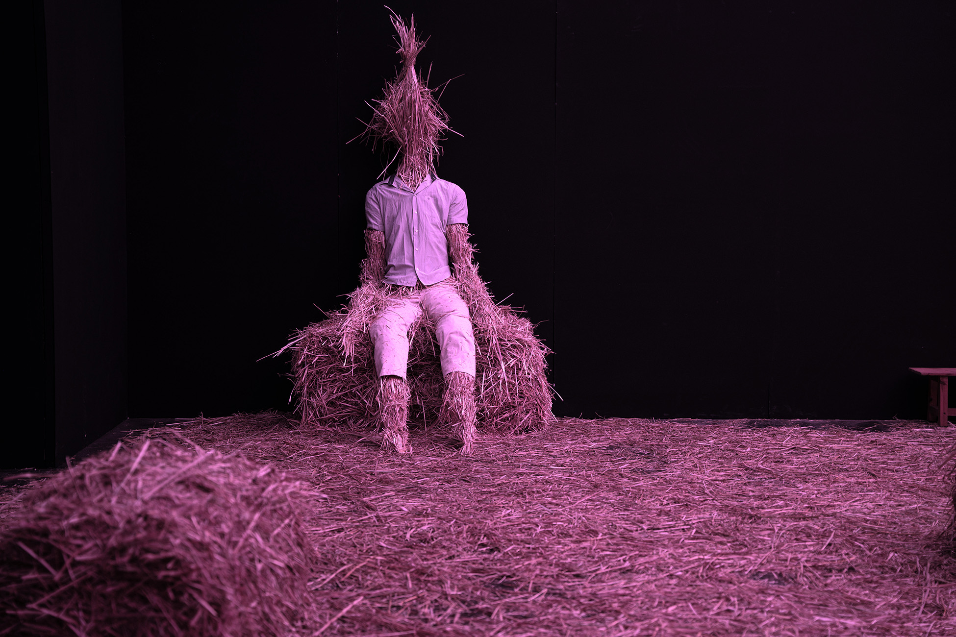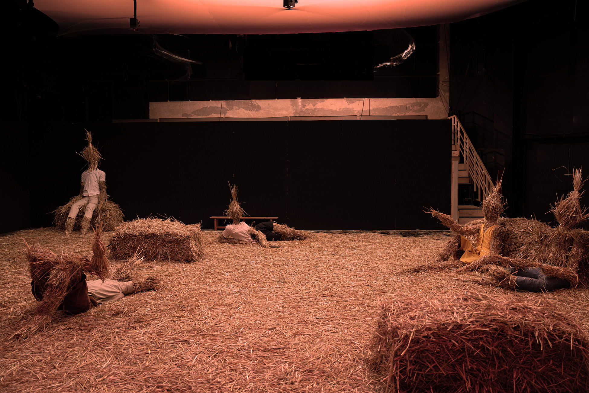 In 'The Dreamers' Solo Exhibition, the central theater hall of HAZIRA, transforms into a post-human realm, a perpetual tension between two worlds: the celestial and the earthly. Above, artificial sky, and below, the stage as the ground.